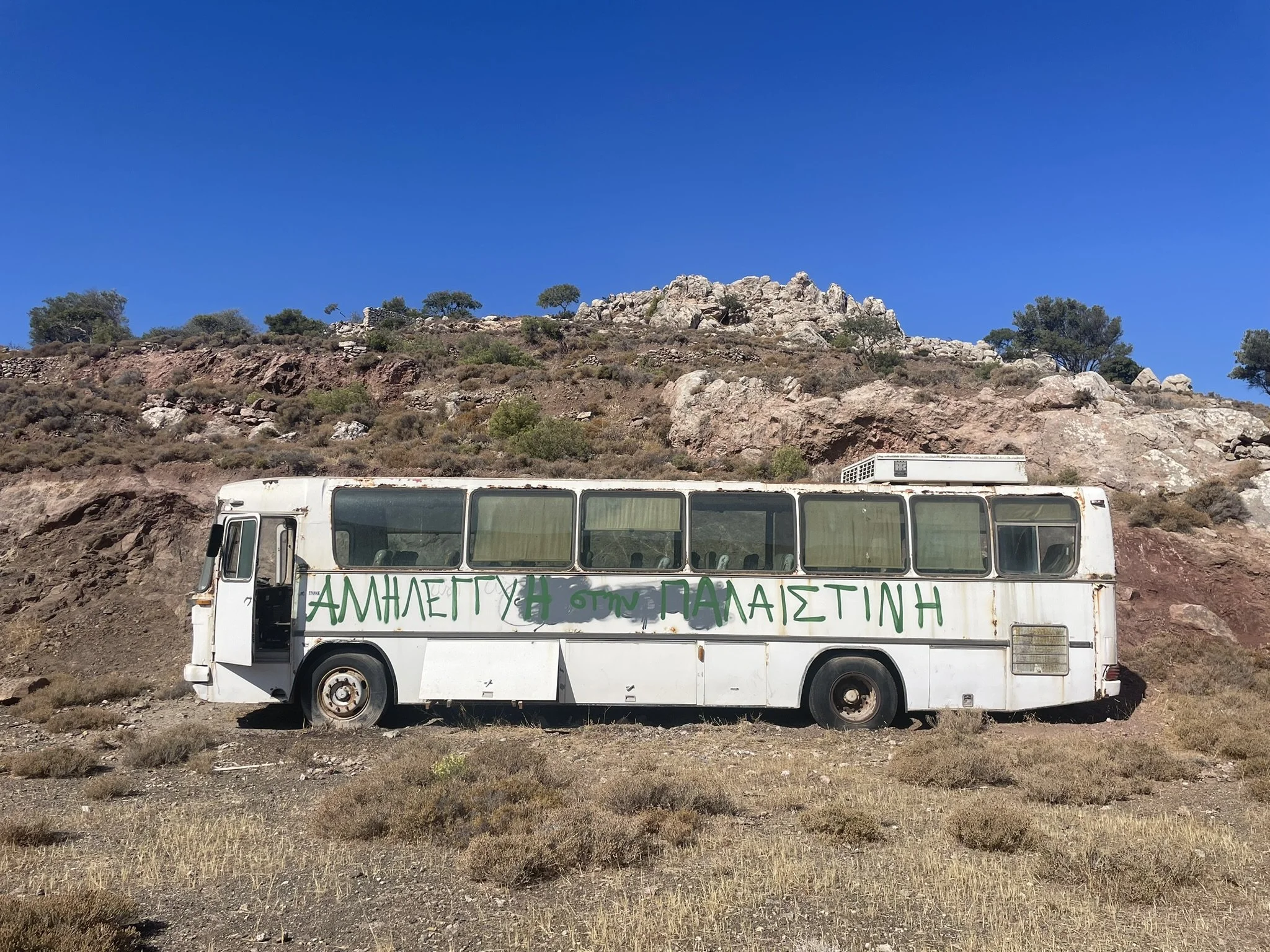 Ένα εγκαταλελειμμένο λεωφορείο με τις λέξεις “ΑΛΛΗΛΕΓΓΥΗ στην ΠΑΛΑΙΣΤΙΝΗ” γραμμένες κατά μήκος του. Τήλος, Αύγουστος 2025.